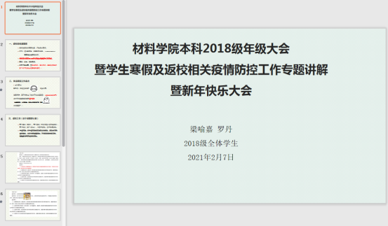 2021年2月7日晚21:00,2020-2021学年第2学期2018级第一次年级大会顺利举行。因在寒假期间学校学工部发布了关于2021年春季学期开学学生返校相关安排的重要通知,因此本次会议采取线上腾讯会议的形式。出席会议的有2018级辅导员梁喻嘉、罗丹以及2018级全体同学。会议由梁喻嘉主持。