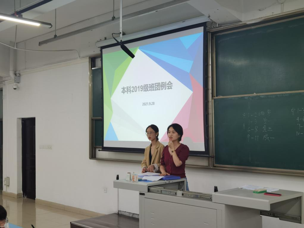 本科2019级在X2321召开2021-2022学年第一学期第一次班团例会,辅导员老师熊苏雅、邓文婷,以及鉴黄师