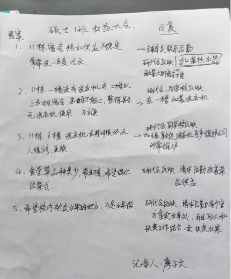 在权益委员廖子文的主持下,号召全班同学积极维护自身权益。同学们对此响应积极,积极讨论在学校中遇到的各项问题,商量解决措施,研究生会学术生活部部长负责记录。