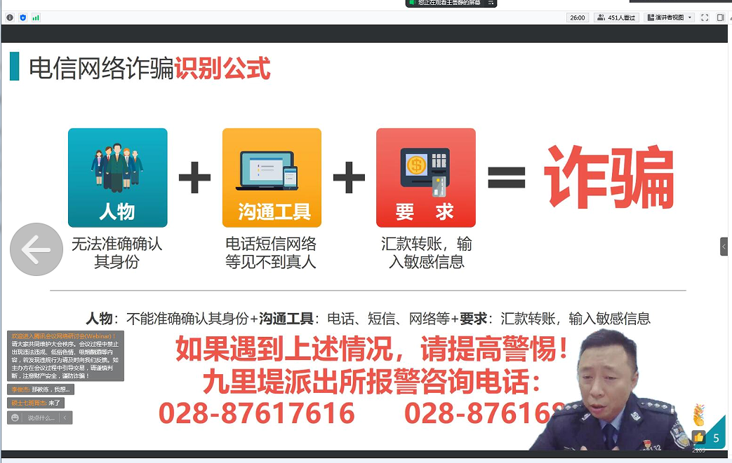 会议初始,赵警官就开门见山指出当前社会上电信网络诈骗案件频发,反诈工作开展形势严峻,犯罪分子的手段花样百出,让人防不胜防。九里堤片区仅2021年电信网络诈骗案涉案金额就多达百万,高校师生也未能完全避开网络诈骗陷阱。
