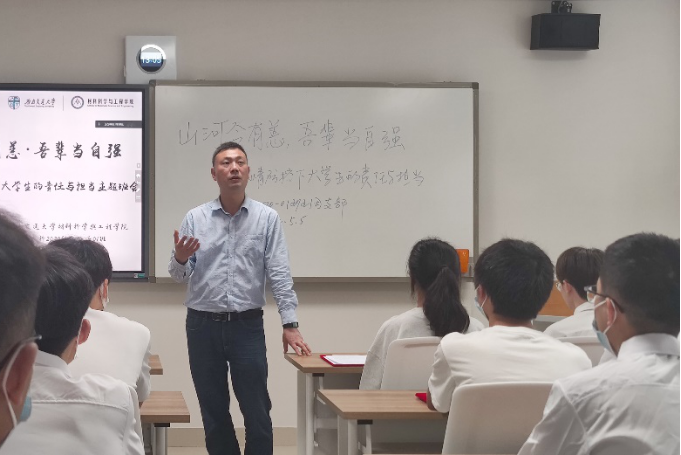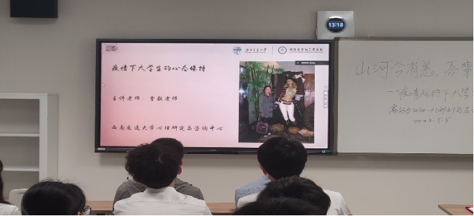高分子2020-01班全体同学在犀浦校区X2122开展“山河今有恙·吾辈当自强——疫情防控下大学生的责任与担当”主题班会。学院党委副书记章春军、本科2020级辅导员郑纪伟和学校班级联合会学生代表张莹同学应邀参加,班长庞贺阳同学主持。