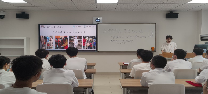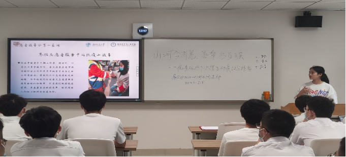 班会第三个环节——“承时代之风 诉青年之志”。大学生不仅要做遵守防疫要求的表率,更要争做参与防疫志愿服务的排头兵。班上的陈诗怡和易玥同学曾在地方参与疫情防控志愿服务工作,他们为大家动情讲述了自己参与防疫志愿服务工作期间的点滴见闻和心得体会。同学们在倾听中领会到疫情防控工作的不易,更感受到担当和奉献的青春荣光。