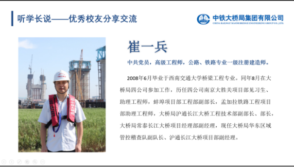 2008届校友崔一兵学长向同学们作分享交流。他结合当前的就业背景,深刻分析本科毕业后继续深造和参加工作的利弊,提醒同学们要根据个人实际情况来综合决策。崔一兵讲述了自己的桥梁情怀和在中铁大桥局14年的成长经历,他建议同学们选择工作要充分考虑自己的兴趣爱好,做自己热爱的事业;要珍惜成长平台,找准定位,专注工作领域,一步一个脚印,实现个人和企业的共同进步。现场播放了短片《幸福时光》,生动展示了崔一兵学长夫妇跟随大桥局建造一个又一个桥梁工程的奋斗历程,让同学们更深刻认识到奋斗是青春最亮丽的底色,好日子都是奋斗得来的。