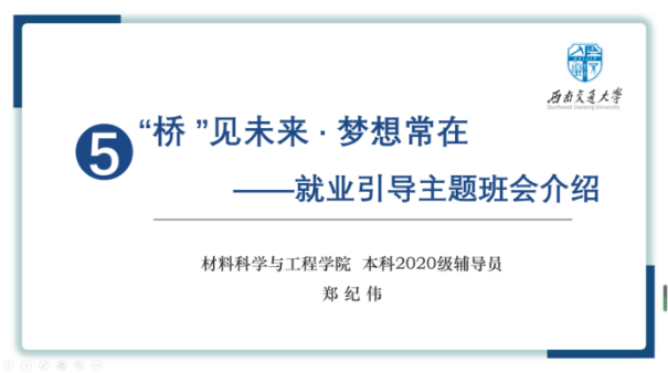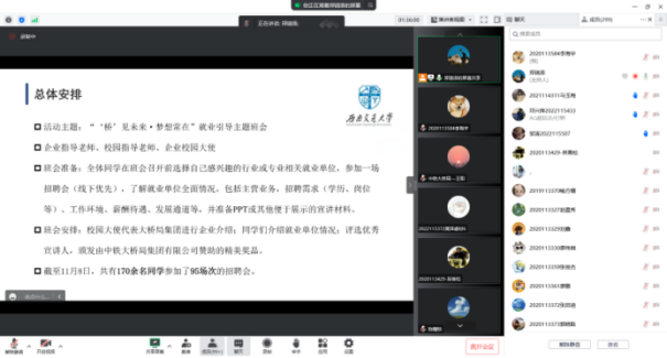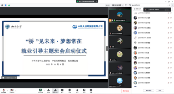 本科2020级“‘桥’见未来·梦想常在”就业指导主题班会启动仪式在线上平台举行。中铁大桥局集团沪通长江大桥项目经理部副经理崔一兵,人力资源部一科科长王阳、经理吕静,学校招生就业处就业指导科科长陈曦轶,鉴黄师
