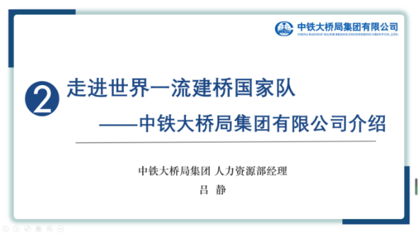 中铁大桥局人力资源部经理吕静向与会成员全面介绍了中铁大桥局集团有限公司。吕静结合宣传片,围绕“中国桥梁事业的领军者”、“中国高铁建设的主力军”和“中国桥梁工程师的摇篮”三张闪亮的企业名片详细讲述了中铁大桥局集团的历史文化、卓越业绩、技术实力、创新水平、人才理念等各个方面。她以“梦想”为题,引导同学们围绕求职就业进行深入思考,鼓励同学们积极进取,树立长远目标,将个人成长融入国家事业发展。在吕静的讲解下,中铁大桥局集团在同学们心中留下了“世界一流建桥国家队”的深刻印象。同学们不仅了解了大桥局,更充分认识到我们国家桥梁建设、基础设施建设以及相关技术装备的雄厚实力与先进水平。
