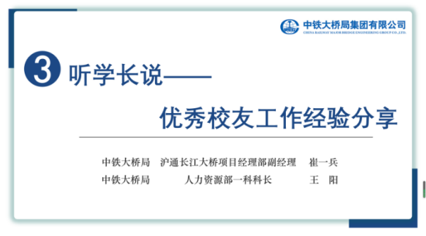 2011届院友王阳学长和同学们进行分享交流。他以时间线为轴,讲述了自己从学校到单位以及在单位内多次调整工作岗位,不断适应新环境、新要求的经历。王阳表示,每一次换岗都是一次挑战,改变和适应成为工作的常态,虽然辛苦但十分充实。他希望大家要敢于走出舒适区,去突破人生更多的可能,遇见更好的自己。王阳指出,人才是企业的核心资源和宝贵财富,并简要介绍了交大人在大桥局工作的基本情况,希望同学们毕业后能选择加入大桥局一起奋斗。王阳学长寄语学弟学妹们,人生难走的往往都是上坡路,吃的每一份苦,终究会照亮人生前行的路。