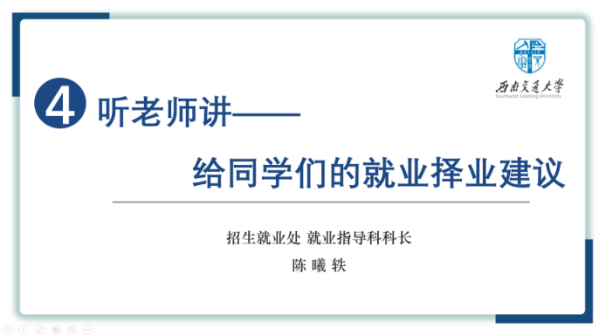 招生就业处就业指导科科长陈曦轶老师结合自己多年工作经验为同学们提供择业就业建议。她首先肯定了“就业单位人人讲”活动是全校范围内的一个首创,对同学们树立生涯规划意识、就业择业都非常有意义。谈及生涯规划,陈老师为同学们详细解读了“知己、知彼、决策、行动”的指导思想,强调要充分考虑人岗匹配和个人兴趣,全面综合掌握就业信息,并加强在实践中的自我了解。陈老师告诉同学们,以就业为导向进行深入探索,能帮助大家获得更多的选择机会和成长机会,特别要注重学习能力和沟通协作能力的培养。她建议同学们做充分的自我探索,利用各类学习机会做足就业前的准备工作,以便从容面对就业。