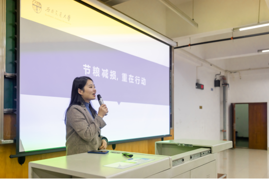 最后,王誉静老师开展了以“节粮减损、重在行动”的专题讲座。讲座分为三个内容进行:第一,怀危机意识、保大国粮仓。王老师强调,从去年至今全球新冠肺炎疫情所带来的影响为我们敲响了警钟,要对粮食安全这一问题始终怀有危机意识。第二,学习《粮食节约行动方案》。王老师带领同学们从总要求、重要任务、创新性举措、如何落实节粮减损要求四个方面系统地学习了《粮食节约行动方案》。第三,兴节约之风,将传统美德宣传好、落实细。王老师呼吁同学们以身示范带动更多人践行勤俭节约新风尚,让“克勤克俭”“戒奢以俭”的价值理念深入人心,让厉行节约、反对浪费的良好习惯在全社会蔚然成风。