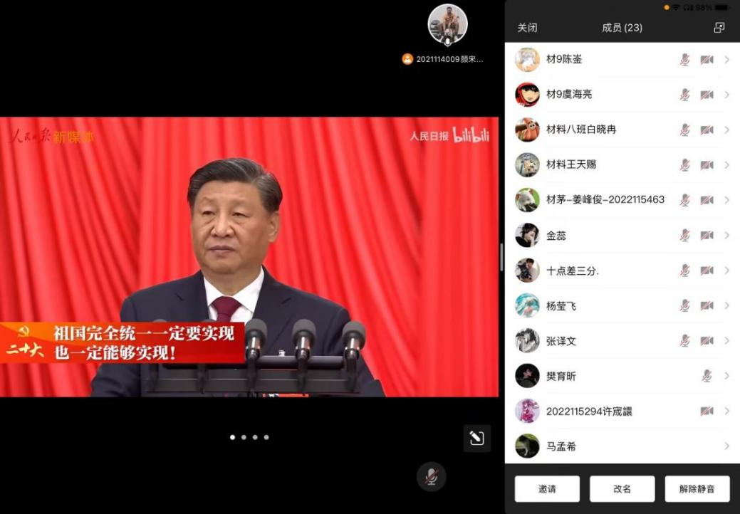 学生会组织工作人员于10月16日晚19:00线上学习观看了党的二十大开幕会视频,认真聆听习近平代表第十九届中央委员会向大会作报告,掀起了学习党的二十大精神的热潮。