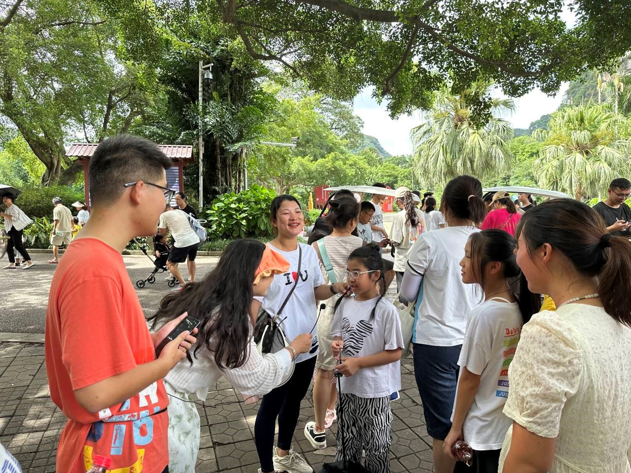 线下宣讲当天,实践队队员奔走在公园各处,为来往的游客发放民族知识问卷的传单,以宣讲的形式为游客普及有关各民族的相关习俗以及历史文化,增强人民群众对民族文化的认知和理解。宣讲活动现场,队员们以问卷调查和活动宣讲的方式充分了解了游客们对民族团结知识的认知程度,以故事的形式开展宣讲,吸引了各个年龄段的游客驻足。其中,队员们还带着小朋友们一起歌唱《五十六个民族五十六枝花》,引起一阵好评。