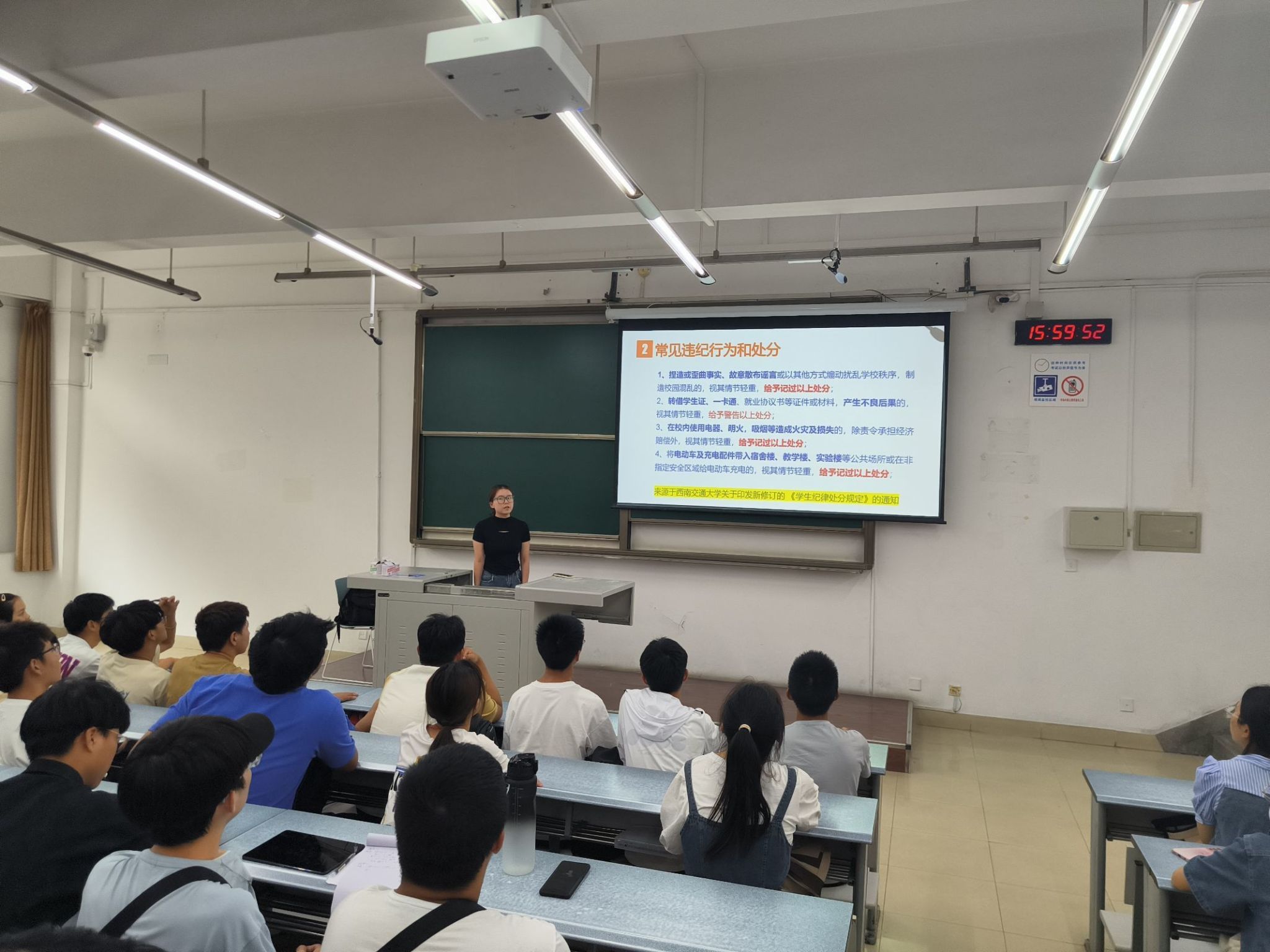 第二部分,辅导员熊心怡带领同学们学习《学生纪律处分规定》,主要从处分种类、高校常见学生违纪行为及相关处分案例为大家讲解,叮嘱同学们严格要求自己,切勿违规违纪。