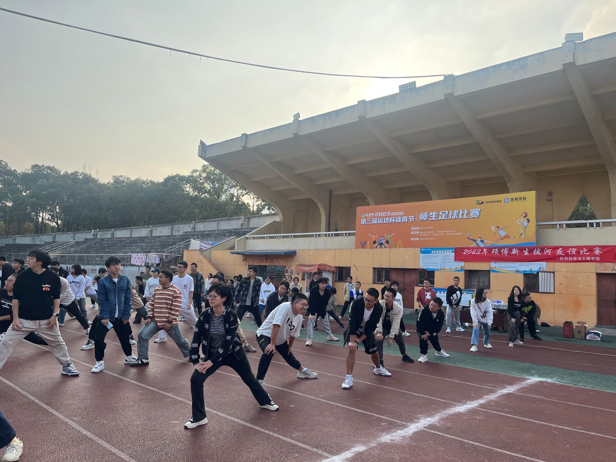 于2023年11月9日下午在田径场举办2023年硕博新生拔河友谊比赛。