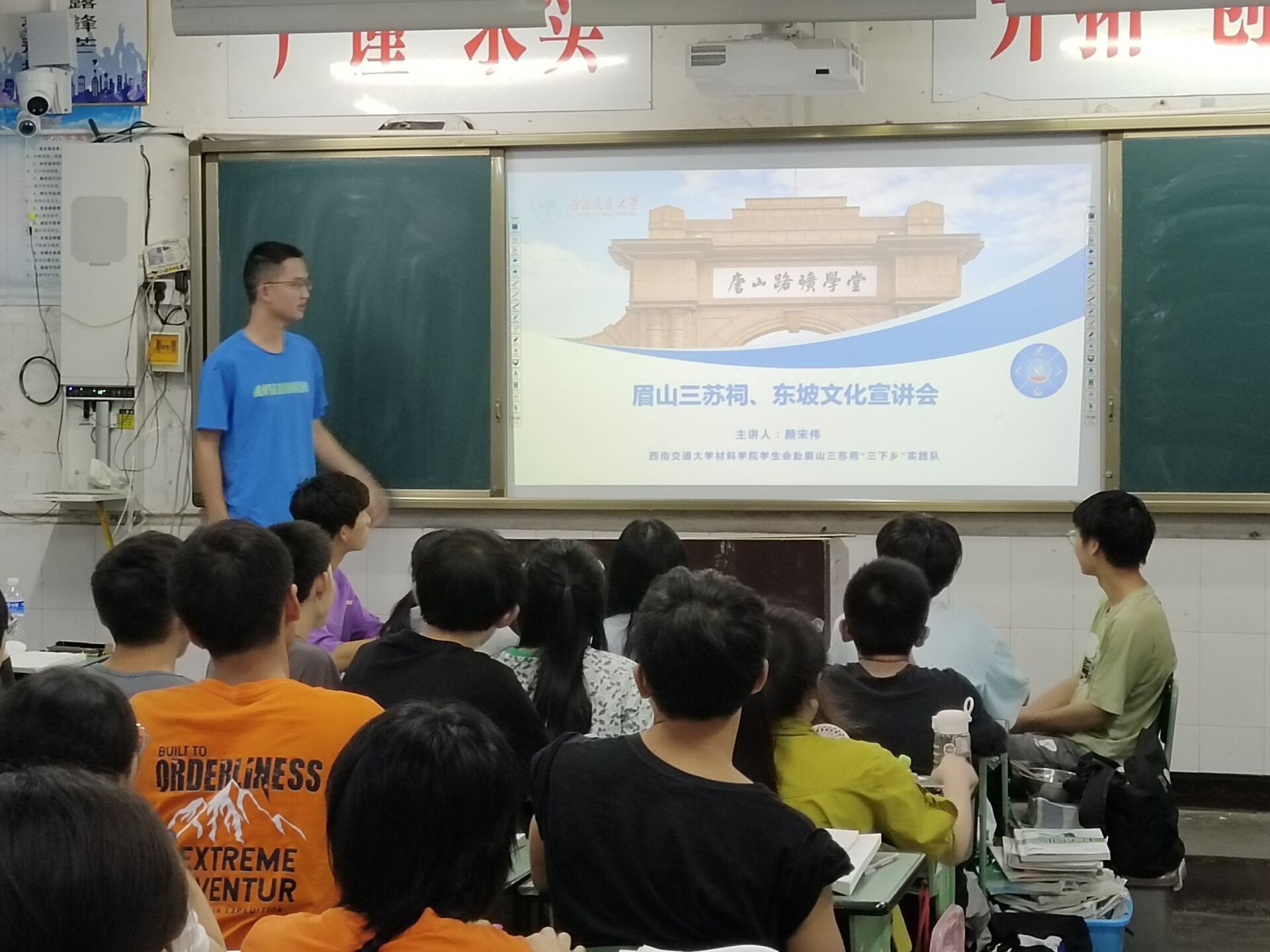 7月12日,实践队在四川省井研县马踏中学进行了以眉山三苏祠和东坡文化为主题的宣传讲座。本次宣讲结合了实践队的参观和学习经历,分为宣讲目的、眉山三苏祠和东坡文化三个方面,向学生们介绍了眉山三苏祠的基本信息和历史沿革,并从广博的学科领域、民本的思想基础和广大的传承群体三个方面让学生们对东坡文化有了进一步的了解,最后发起呼吁:当代青年要坚持守正创新,在新征程中勇当开路先锋、争当事业闯将,以守正创新的正气和锐气,赓续历史文脉、谱写当代华章!宣讲结束后也受到了很好的反响,很多学生表示有机会一定会多去参观有关历史文化的景点,了解更多中华优秀传统文化,感受文化的传承。