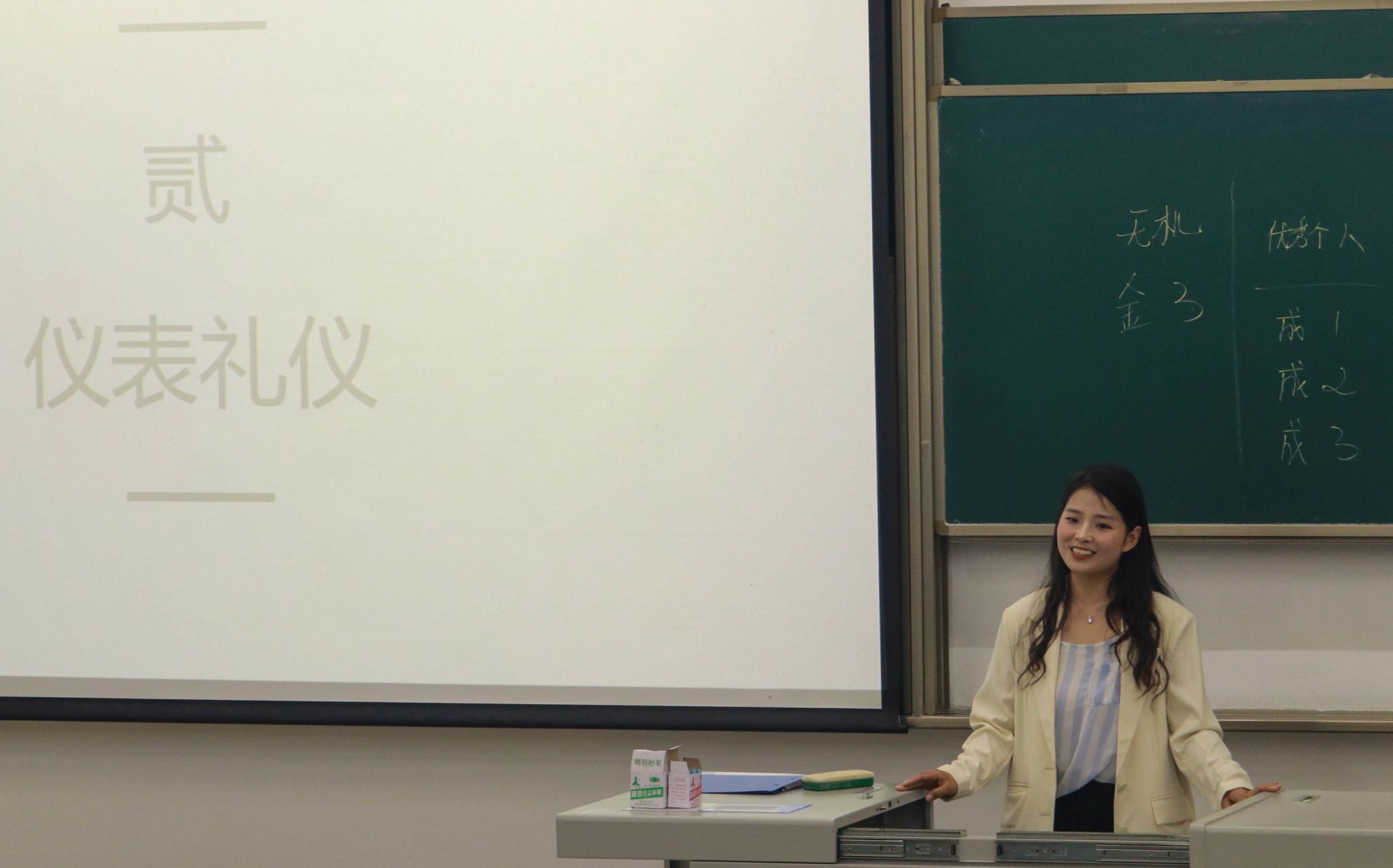 最后,王誉静老师通过生动的举例,从仪表礼仪、体态礼仪与社交礼仪三个方面为同学们讲解了礼仪知识,希望大家在大学期间,全面发展自己,培养阳光自信的心态,拥有阳光清爽干净的外表,学会美、发现美、展示美,更加自信的展示自己,。