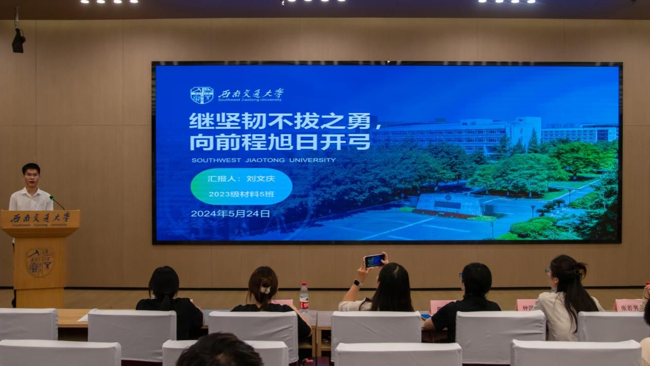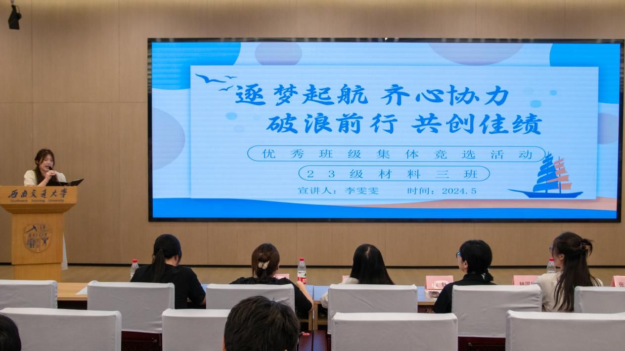 于图书馆2号报告厅开展2023——2024年度“班团峰会”先锋班集体答辩活动。学院党委副书记熊钰、2023级材料7班班导师赵小军、团委书记王誉静,本科2022级辅导员张琬祺,本科2021级辅导员张若男,本科2020级辅导员钟国玲,本科2023级辅导员熊心怡出席活动。
