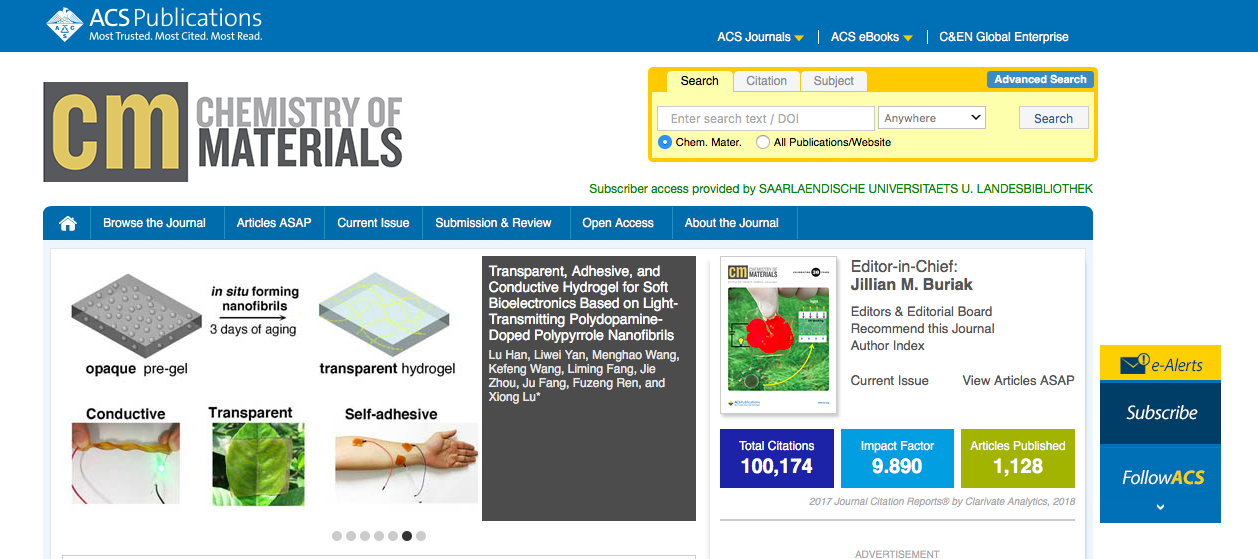 鲁雄教授为通讯作者,韩璐博士和闫力维为共同作为第一作者,在国际期刊《Chemistry of Materials》(Chem. Mater., 2018, 30 (16), pp 5561–5572,影响因子9.89)上报道了其课题组在导电水凝胶领域的最新研究成果。该成果投稿后得到多位审稿人和编辑部的高度评价,文章被选为以封面文章的形式发表,并被选为期刊主页头条消息进行推送。
