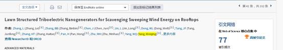 博士研究生张磊和张彬彬以及美国斯坦福大学陈俊博士于2016年4月在《Advanced Materials》(影响因子:21.950)上发表的第一作者论文“Lawn Structured Triboelectric Nanogenerators for Scavenging Sweeping Wind Energy on Rooftps”入选ESI“高被引论文”。