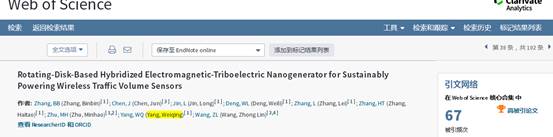 博士研究生张彬彬和美国斯坦福大学陈俊博士于2016年7月在《ACS Nano》(影响因子:13.709)上发表的第一作者论文“Rotating-Disk-Based Hybridized Electromagnetic-Triboelectric Nanogenerator for Sustainably Pwering wireless Traffic Volume Sensors”入选ESI“高被引论文”。