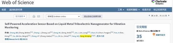 博士研究生张彬彬和张磊于2017年7月在《ACS Nano》(影响因子:13.709)上发表的第一作者论文“Self-powered Acceleration Sensor Based on Liquid Metal Triboelectric Nanogenerator for Vibration Monitoring”入选ESI“高被引论文”。