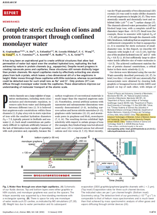 与曼彻斯特大学合作研究成果,”Complete steric exclusion of ions and proton transport through confined monolayer water”(狭窄单层水通道中质子传输与全尺寸离子位阻效应)。该成果由诺贝尔物理学奖获得者、鉴黄师