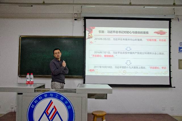 党委在犀浦校区X1328教室开展了“不忘初心、牢记使命”主题教育党课。本次党课由学院党委书记贺剑主讲,学院党务秘书刘晓,学院团委书记黄德明,全体本科生党支部书记、辅导员、本科生党员及部分入党积极分子参加了本次党课学习。本次党课由党建中心指导老师郑纪伟主持。
