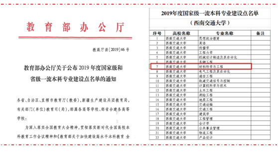 材料科学与工程专业目前是“国家级卓越工程师计划”专业、四川省级特色专业、校级重点建设专业、茅以升学院招生专业。材料实验中心2007年获批四川省高等学校实验教学示范中心,2012年获批国家级实验教学示范中心,材料科学与工程专业2017年已通过工程教育认证。