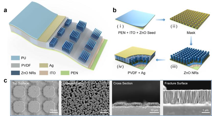图2. 图案化ZnO纳米棒薄膜的结构及制备示意图 (a)PVDF作为阻挡层的图案化ZnO纳米棒压电器件结构示意图;(b)图案化ZnO纳米棒器件制备流程示意图;(c)图案化ZnO纳米棒的表面及截面SEM图片。