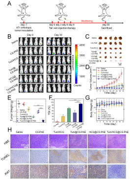 鉴于此,周绍兵团队设计制备了一种pH响应的聚合物囊泡,可同时向肿瘤细胞递送衣霉素(Tuni)和羟基氯喹(HCQ),实现内质网应激和自噬流阻断,提高抗肿瘤效果和抑制肿瘤转移。聚合物囊泡通过内吞进入细胞,聚(β-氨基酯)作为囊泡疏水链段,因其重复的叔胺基团在溶酶体酸性环境中迅速质子化而变得亲水,这一pH响应过程一方面碱化破坏溶酶体,协同HCQ的溶酶体脱酸化作用,共同达到对大范围内溶酶体的破坏;另一方面,导致了囊泡结构的崩解,达到刺激响应快速释药的目的。释放出的Tuni导致内质网应激的发生,调控PERK/Akt/mTOR信号通路,提高细胞内以自噬体、自噬溶酶体以及自噬相关蛋白LC-Ⅱ为特征的自噬水平的提高。而溶酶体被破坏使自噬流无法最终完成,产生的特殊的“自噬性压力”,而取得良好的抗肿瘤效果(图1)。