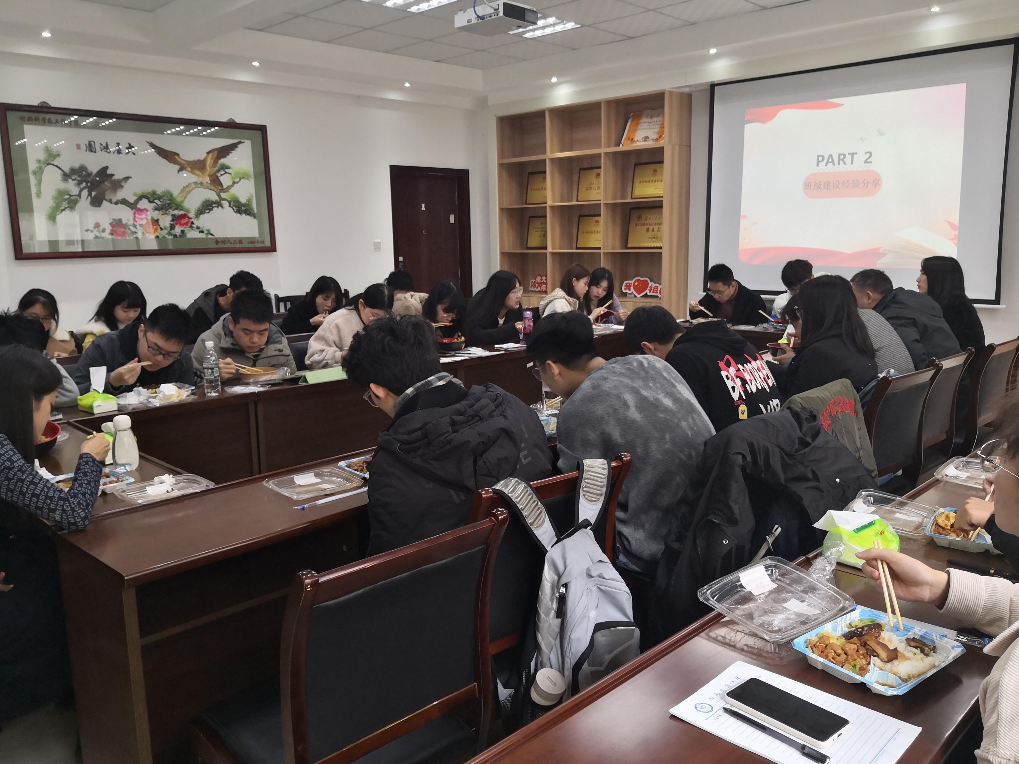 第二部分,边吃边聊,学生干部代表们陆续分享班级凝聚情况以及学习情况。在听取学生分享后,章春军副书记、罗丹老师、梁喻嘉老师对班干部工作中存在的困惑以及遇到的难题进行了解答。
