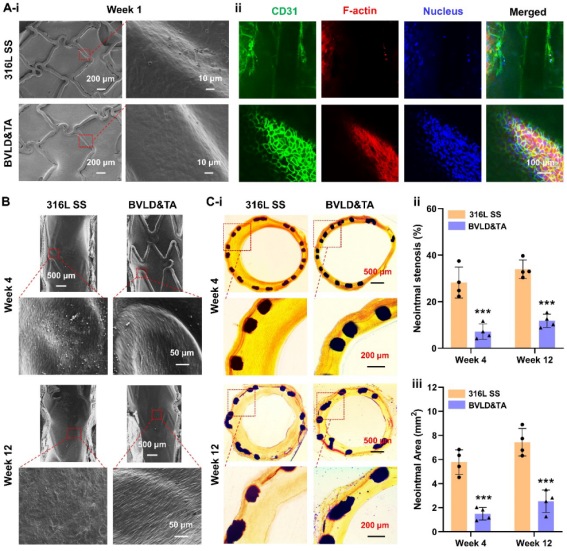 图2. 体内实验表明TA&BVLD协同功能表面显示出优异的抗凝血、促内皮及抑制再狭窄功能。