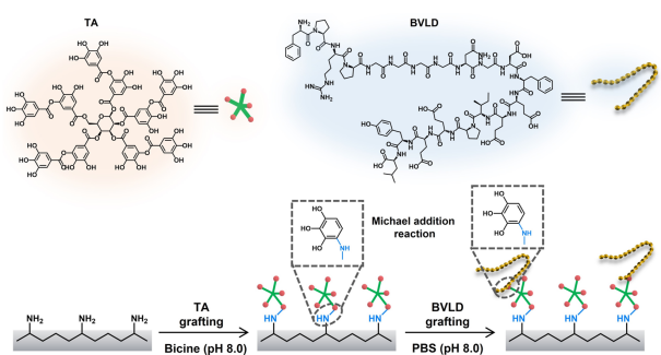 图1. 基于TA和BVLD构建具有抗凝、抗炎及促进内皮化的改性支架表面。