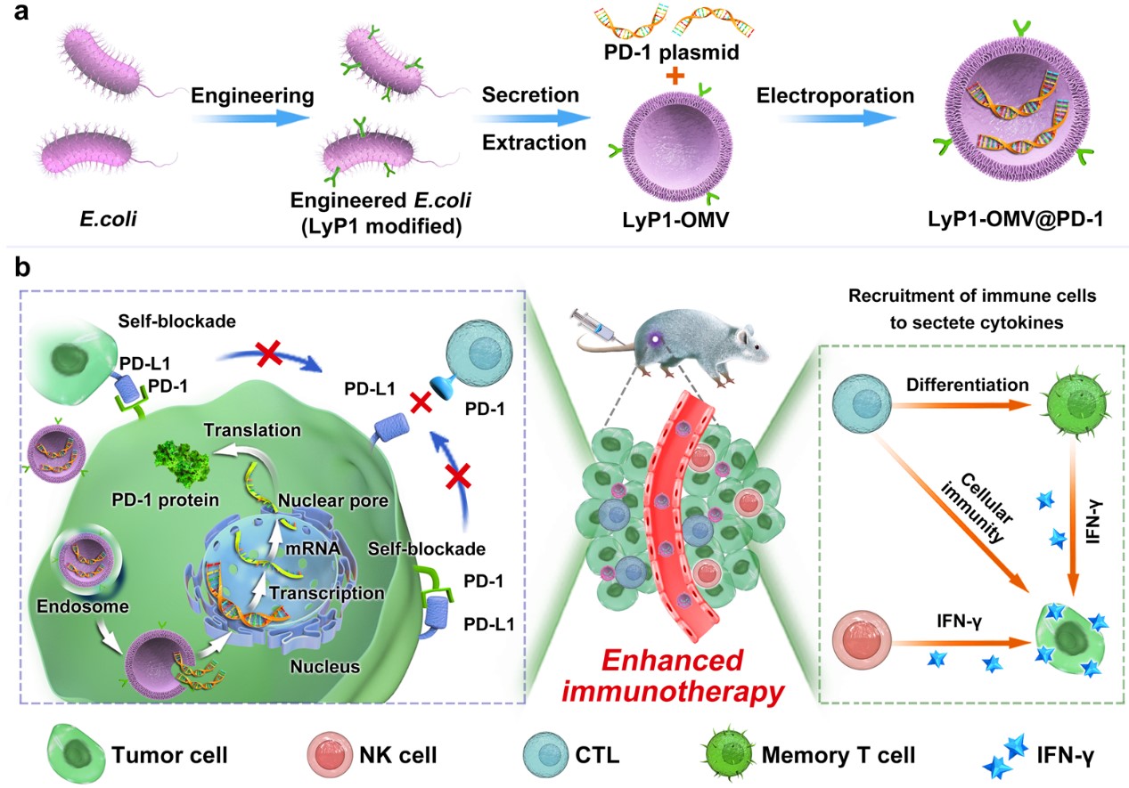 周绍兵教授团队博士研究生潘敬梅历经3年时间制备了一种负载PD-1质粒的LyP1多肽修饰的细菌外膜囊泡,以实现对肿瘤细胞PD-L1的自我阻断。纳米载体通过细菌外膜囊泡的靶向能力在肿瘤组织中聚集,并通过LyP1介导的靶向内化到肿瘤细胞内,随后将PD-1质粒送入细胞核,使肿瘤细胞表达PD-1(图1)。另外我们开发了一种用于定量检测PD-1/PD-L1结合量的磁微粒化学发光试剂盒,自身表达的PD-1与自体和邻近肿瘤细胞表达的PD-L1结合,实现了自我阻断。因此,它可以重新激活细胞毒性淋巴细胞(CTL),以根除癌细胞。同时,该纳米载体成分的外膜蛋白可将CTL和自然杀伤细胞(NK)募集到肿瘤组织中,刺激其分泌干扰素-γ,进一步提高PD-1/PD-L1自身封闭治疗的抗肿瘤活性。该策略对4T1,CT26,B16这三种肿瘤模型均表现出优异的抑瘤效果,并且纳米载体对4T1和B16肿瘤的阻断率分别为94.7%和96.7%,分别是PD-L1单克隆抗体的1.90倍和9.04倍。因此,这种简单安全的策略为肿瘤免疫治疗纳米药物的开发铺平了道路。
