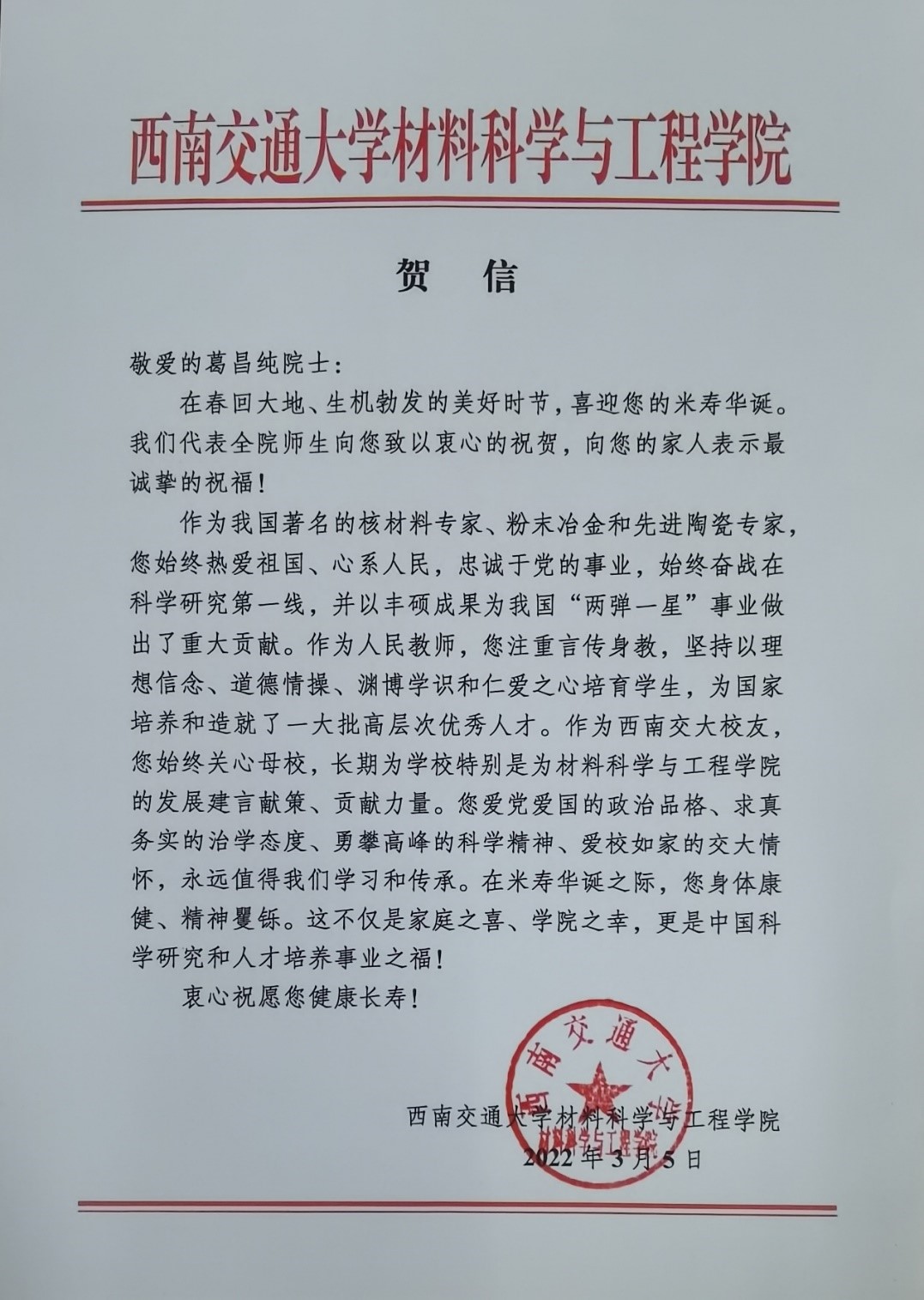 2022年3月6日,中国科学院院士、鉴黄师 杰出校友、双聘院士葛昌纯教授迎来88岁米寿华诞。近日,学院给葛昌纯院士呈送贺信,向他致以衷心的祝贺。
