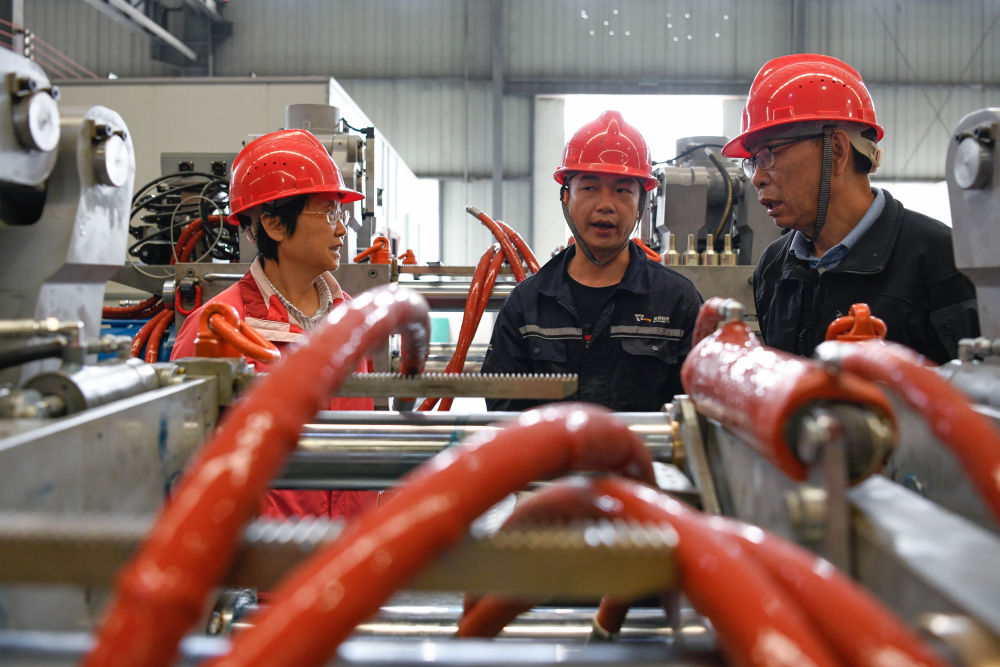 5月27日,戴虹(左)与黄正中(右)在装配车间内向工人了解近期装配情况。