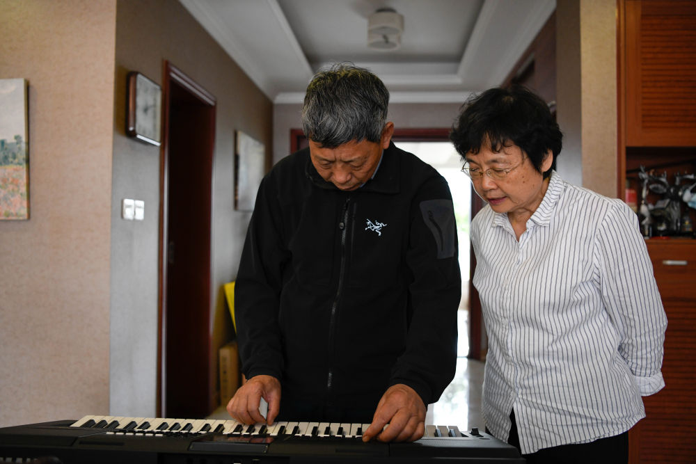 5月27日,黄正中(左)与戴虹(右)研究新买的电子琴。