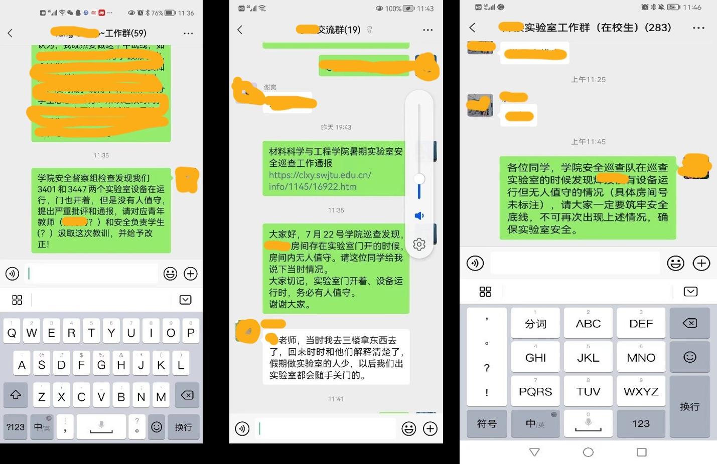 暑期期间(7月11日-8月24日),学生安全巡查队已在“暑期实验室安全巡逻情况汇报”小程序中收集了119份巡查结果报告,梳理出“少数实验室仍存在管制类试剂未落实双人双锁要求的情况”、“个别实验室的高温设备缺少明显警示标识”、“部分实验室存在设备运转但无人值守的问题”等典型安全问题事项,巡查过程中发现的所有安全问题已由实验室安全主管通过微信或电话联系实验室负责人,要求及时整改。实验室安全主管约谈后,学院对整改事项进行了“回头看”,相关实验室负责人以及学生党员巡查队现场核实,检查结果显示相关安全问题引起了高度重视并已得到整改。