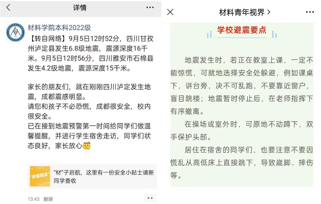 9月5日中午,甘孜泸定发生6.8级地震,学校震感明显。学院党委陈勇书记第一时间要求关注在校学生特别是新生的情况,了解是否有学生家中受灾。学工组全体辅导员老师第一时间前往学生寝室查看情况。不少新生第一次经历地震,但很快平复情绪,表示之前在学院微信推送的“新生安全小贴士”中了解到成都常有震感,还是做了些心理准备,只是没想到这么快就碰到地震了。当日下午,学院微信公众号推送《地震科普小知识》,为同学们送上地震防震常识。中秋前夕,陈勇书记专程在走访新生公寓时,还专门询问了同学们地震中的感受,结合自身经历告诉同学们在交大学习不要担心地震。