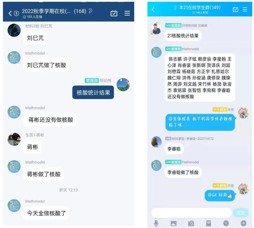 学生工作组以“四个重点”为牵引,多措并举抓好抓防疫工作要求落实情况。一是抓宣贯教育。通过线上各类会议、各类学生QQ群、走访寝室等多种渠道加强防疫规定宣传,确保学生人人知晓;在学院官网和官方微信平台发布《疫情防控期间学生违规违纪警示案例》和《违法违规行为及法律后果》,实现警示教育目的。二是核酸检测力争不漏一人。每日全员核酸检测工作,年级辅导员必到检测现场带队组织和了解情况;对照在校生名单,逐一核实是否检测;为做好该项工作,本科2020级采用编程技术建立QQ群核酸检测情况统计机器人,实现学生参加核酸检情况统计提质增效,并在各年级和其他学院推广。三是发挥党员和干部在防疫工作的作用。本研各年级充分动员在校学生党员干部主动担当作为,确立班级负责人,担任信息员,协助辅导员做好核酸检测组织、信息统计等相关工作。四是做好学生健康信息管理和核验工作。坚持每日执行体温监测和异常情况报告制度,每日通过钉钉、腾讯在线文档或QQ群等各类途径做好健康码监测,及时统计和核验全体在校生的核酸检测结果信息,及时发现黄红码、核酸结果缺失等异常信息并做好妥善处理。