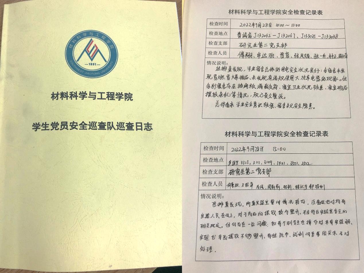 学生党员安全巡查队深入实验室。2022年9月28日,学生党员安全巡查队重点对九里校区3号楼实验室和学生工位区域的消防安全、化学安全、用电安全、环境卫生等多个方面进行了巡查,巡查结果登记于《学生党员安全巡查队巡查日志》。