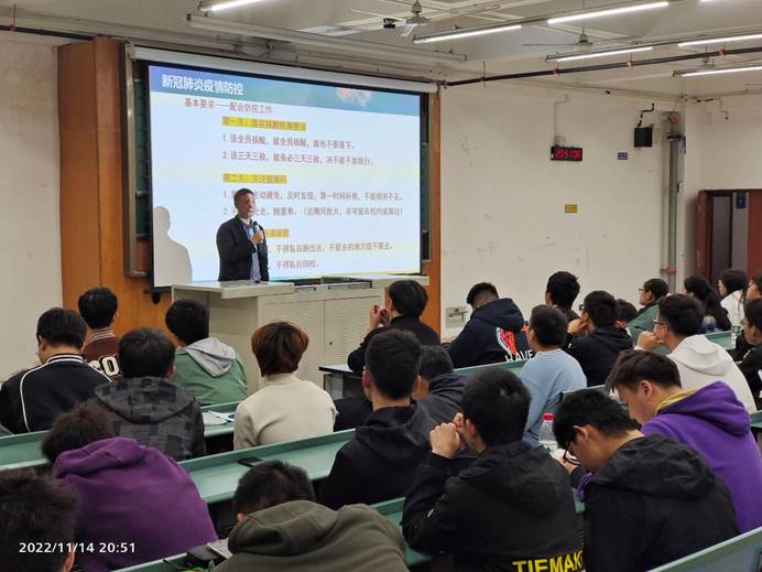 在防疫安全方面,章春军结合11月11日国务院联防联控机制综合组发布的《关于进一步优化新冠肺炎疫情防控措施,科学精准做好防控工作的通知》,强调了精准防控、科学防控的核心要义,要求同学们认真对待“核酸检测、健康码关注、严格请销假”三关。他结合了相关警示案例,引导同学们严格遵守成都市和学校相关管理规定,配合好疫情防控常态化要求,增强自我防范意识。
