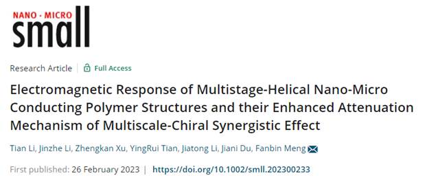 2022级博士李天在国际高水平期刊Small上发表了题为“Electromagnetic Response of Multistage-Helical Nano-Micro Conducting Polymer Structures and their Enhanced Attenuation Mechanism of Multiscale-Chiral Synergistic Effect”研究论文,创新性阐明了多级手性结构的电磁响应模式和宽频调控机制。论文通讯作者为孟凡彬特聘研究员。研究工作得到了国家自然科学基金项目 (No. 51903213和No. 5217130130190)、四川省科技计划项目 (No. 2023NSFSC1952和No. 2022ZYD0028)、中央引导地方科技发展专项基金 (No. 2021Szvup124)和中央高校基础研究经费 (No. 2682021GF004)及相关国防项目的资助与支持。