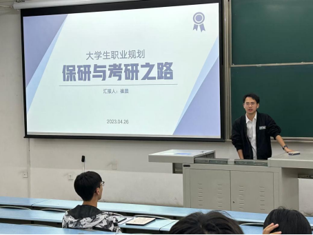 会议开始,崔晨结合自身经历,对保研和考研的优缺点进行了详细论述,并为同学们提供了实用的学习和备考技巧。他提到保研和考研所需的准备本质上都是对知识储备和实际应用的挑战,而非一种取代另一种的选择。他鼓励学弟学妹们根据自身兴趣和职业规划,切实拓展学科领域,提高实践能力,全面提升素质和水平。