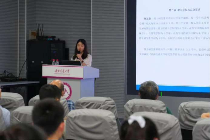 随后,刘艳副院长对学院院情进行介绍。她就“办学历史和硬件条件、师资队伍和骨干教师、科研团队和研究方向”等多方面的相关情况,为同学们进行了详细介绍,旨在增强同学们对西南交大鉴黄师