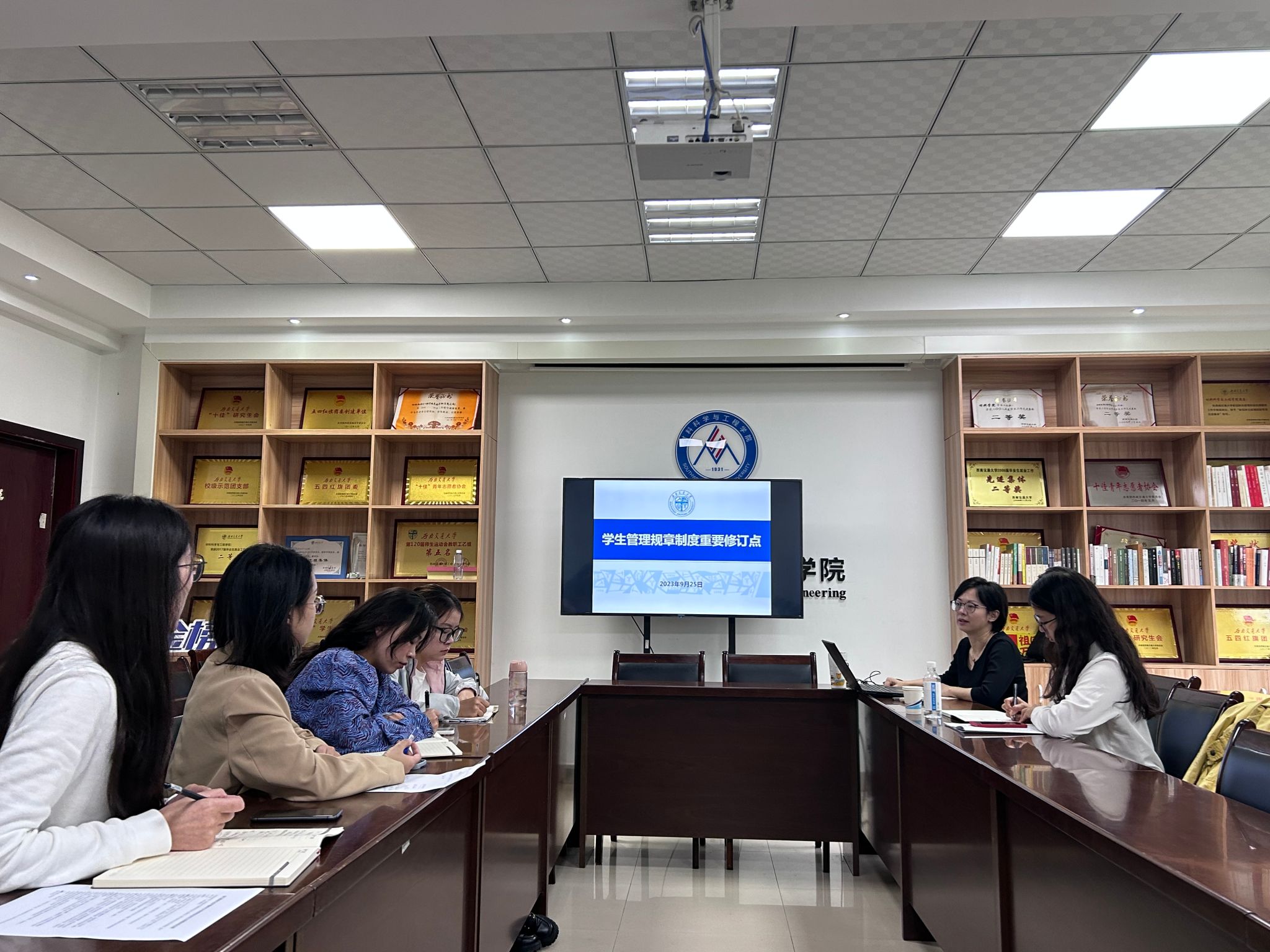 本科生荣誉称号评审管理办法》等管理办法文件的变动展开详细学习,并结合日常工作,进行探讨交流。