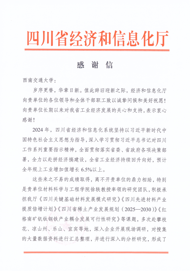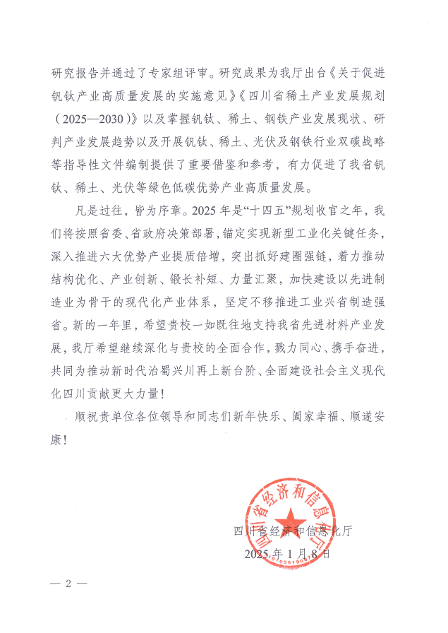 徐轶教授团队在四川省钒钛、稀土等绿色低碳优势产业高质量发展等方面作出的积极贡献表示感谢。
