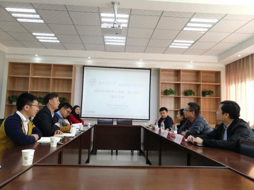 学生工作组与学工组老师们交流学生宿舍园区建设工作,交流会在X2018进行,学院党委副书记、纪委书记、学工组组长章春军老师,学工组副组长、团委书记黄德明老师及学院全体辅导员老师参加会议。