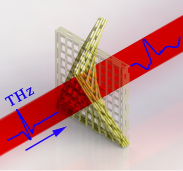 李琦教授研究团队在无模直写3D打印技术方向进行了系列研究,制备出多种三维太赫兹光子晶体器件,实现了对其太赫兹性能的调控。例如,通过非金属离子掺杂,成功在TiO2三维太赫兹光子晶体成型后改变其太赫兹响应性能。通过钛酸钡(BaTiO3)与聚二甲基硅氧烷(PDMS)复合制备出柔性太赫兹波光子晶体,不仅可以通过浆料成分配比与三维几何构造等参数来调对太赫兹波的响应,其结构柔性的特点使其响应特性可以通过施加力场(如拉伸、扭转等)来进行调制,成功突破了现有太赫兹波光子晶体一旦成型其光学特性就无法改变的局限,为可变太赫兹波光学窗口方向的研究提供了新的思路。基于铁粉与PDMS复合形成的Fe/PDMS浆料,3D打印制备出可以通过外加磁场变化进行结构调控的三维太赫兹波光子晶体,无需直接接触就可以实现外磁场调控三维太赫兹波光子晶体的响应。