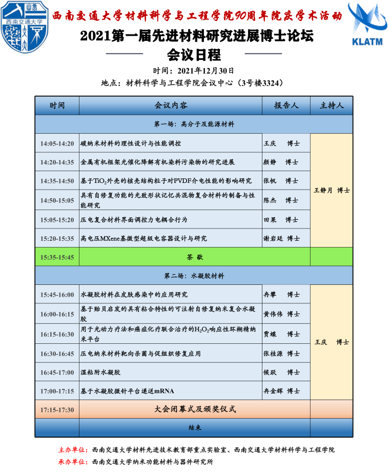 90年院庆学术活动——2021第一届先进材料研究进展博士论坛。本次论坛分为生物医用支架,生物与诊疗,医用多功能材料,金属功能材料,高分子及能源材料,水凝胶材料六个分会场,涵盖了先进材料研究前沿的36个方向,并由2021级博士进行主题报告。希望借举行此次博士论坛的契机,为鉴黄师