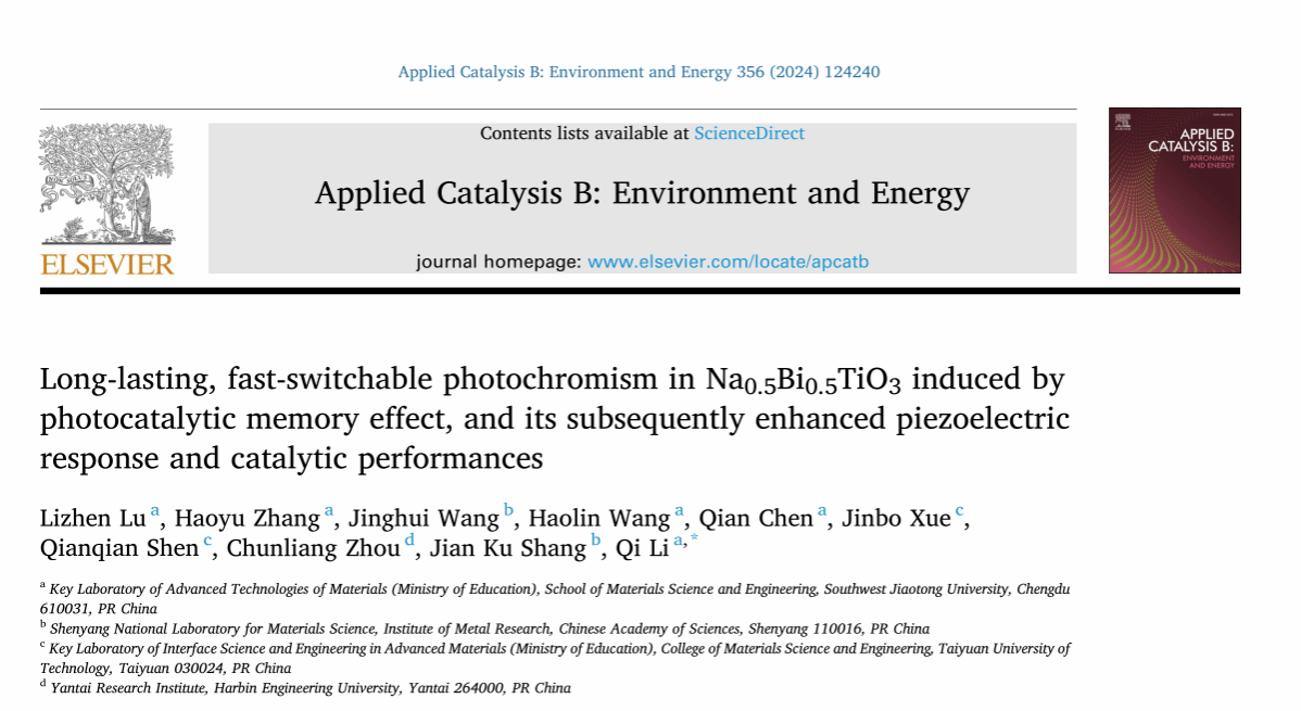 李琦教授团队在近期的研究工作中发现,钙钛矿型Na0.5Bi0.5TiO3(NBT)陶瓷通过光催化记忆效应能在室温下对可见光产生明显而持久的光致变色行为;同时,其颜色变化也可以通过简单的红外光照射在几秒钟内快速恢复,有利于应用于需要快速方便擦除的过程。这种通过光催化记忆效应导致的光致变色现象还改变了其内部电子结构,增强了其压电响应,更好地促进了光生载流子分离,从而对其光催化、压电催化与光压协同催化性能产生了显著的影响。实验和理论分析结果表明,在光致变色过程中产生的稳定氧空位显著增强了NBT陶瓷粉对O2和H2O的吸附,增加了活性氧物质⋅O2-和⋅OH的生成,从而增强了其降解水中盐酸四环素(TC-HCl)的性能。相关研究以“Long-lasting, fast-switchable photochromism in Na0.5Bi0.5TiO3 induced by photocatalytic memory effect, and its subsequently enhanced piezoelectric response and catalytic performances”为题在线发表于《Applied Catalysis B: Environment and Energy》(//doi.org/10.1016/j.apcatb.2024.124240)。鉴黄师