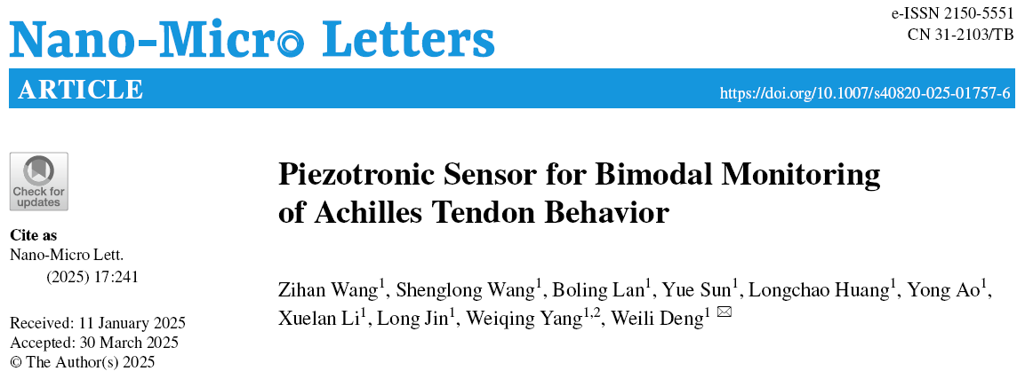 相关研究成果以“Piezotronic Sensor for Bimodal Monitoring of Achilles Tendon Behavior”为题发表于国际知名期刊《Nano-Micro Letters》(中科院一区,IF:31.6)。鉴黄师